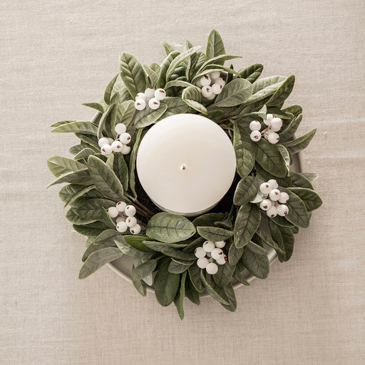 Capture the magic of winter with our Candle Wreath, where verdant leaves and pearl-like white berries create a frosty, enchanting display. This com...