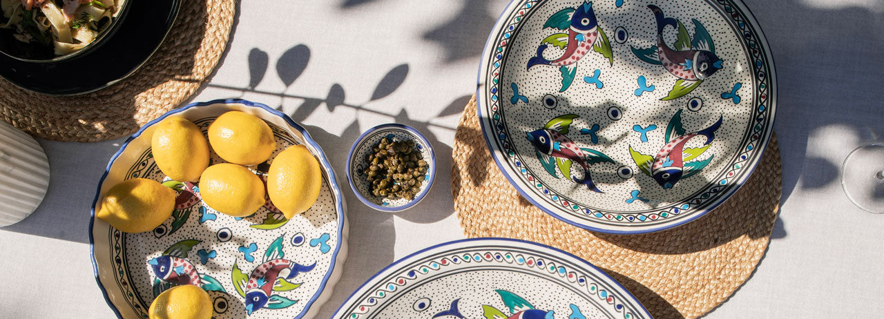 The Tunisian Fish collection is a vibrant new range that brings heritage and craftmanship to your table. Made from white clay and crafted in Tunisia by a multi-generational family of artisans, each piece is hand painted using age old techniques. No two pieces are exactly identical making each item one-of-a-kind.